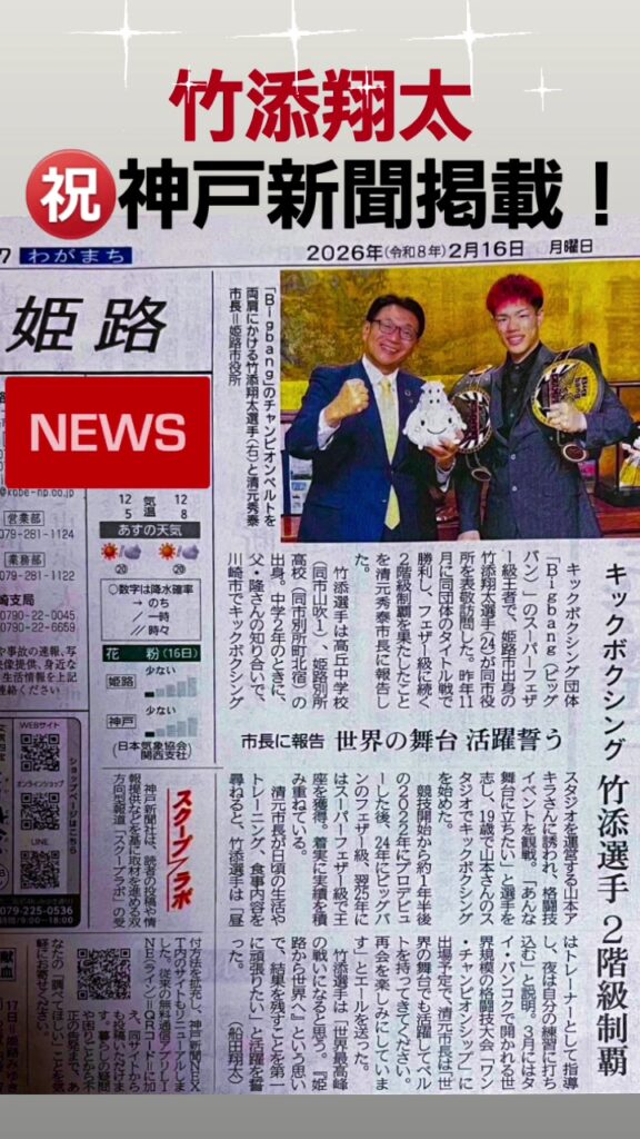 お知らせ ★3/1(日)短縮営業のお知らせ 関連記事 ★3/1(日)短縮営業のお知らせ 2026年2月18日 吉報②✨読売新聞✨掲載 2026年1月23日 吉報✨神奈川新聞✨掲載 2026年1月21日 🎍お年玉キャンペーン🎍 2026年1月7日 ★12/21(日)短縮営業のお知らせ 2025年12月10日 ✨12月も好評につき竹添翔太♡二階級制覇キャンペーン✨ 2025年12月10日 ★年末年始★営業時間のお知らせ★ 2025年11月28日 🥊✨11月超ー目玉キャンペーン✨竹添翔太♡二階級制覇✨🥊 2025年11月7日
